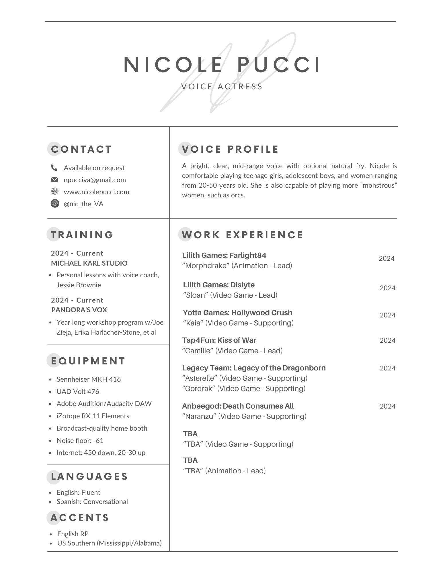 A bright, powerful mid-range voice with dynamic flexibility. Formerly credited as Nicole Pucci.